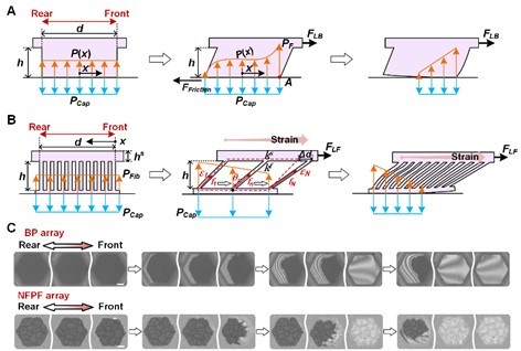 为揭示湿摩擦增强的机理,进一步详细表征了摩擦过程中棱柱形变和界面液膜运动。BP棱柱在底部摩擦力和顶部横向拉力的剪切作用下,棱柱前侧受到明显的挤压应力(图3A),棱柱直径变小(∆d<0),棱柱后侧与基底发生分离。而NFPF棱柱由于其纳米纤毛可以轻易侧向变形,在剪切作用下通过弯曲变形极大的降低了界面分离应力,并将分离区域转移至棱柱前侧,受此影响出现了棱柱直径增大的现象(∆d>0)。在PSAN棱柱的粗糙表面,由于厚液膜毛细力极低,在运动中流动至棱柱后侧,棱柱未出现明显的变形,摩擦力几乎为零(图3C)。